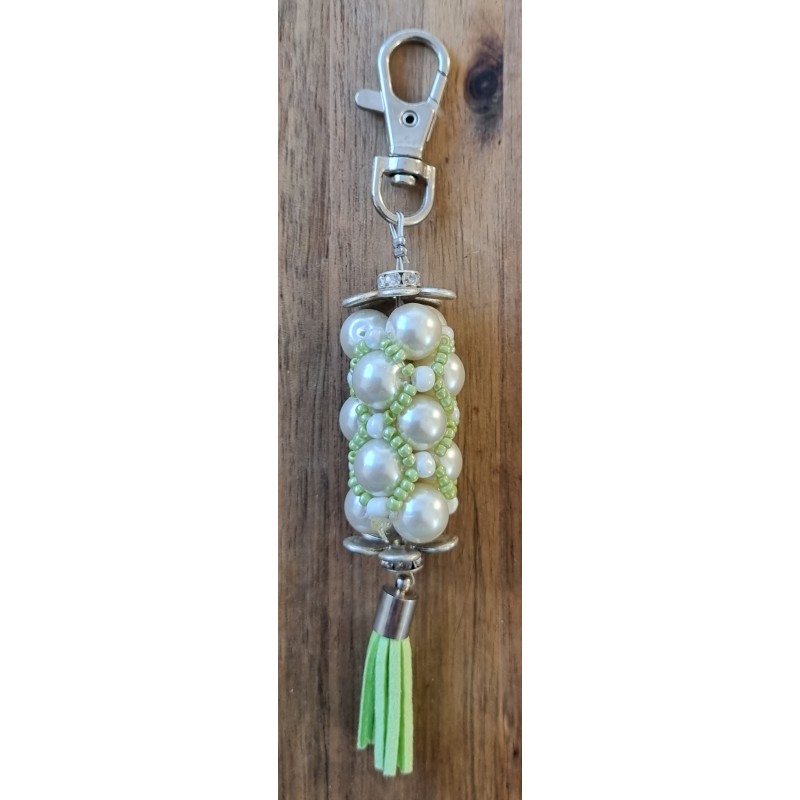Handgefädelter Schlüsselanhänger weiss/hellgrün/silber