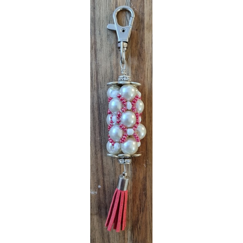 Handgefädelter Schlüsselanhänger weiss/rot/silber