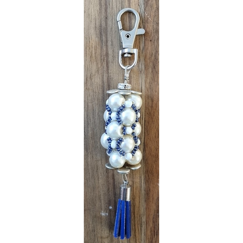 Handgefädelter Schlüsselanhänger weiss/blau/silber