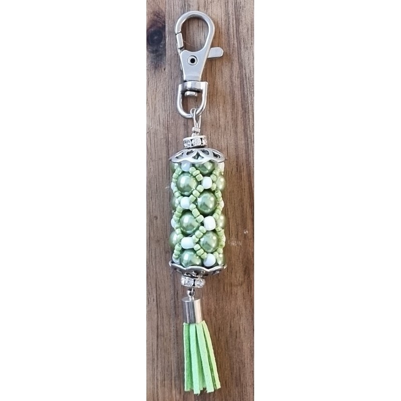 Handgefädelter Schlüsselanhänger hellgrün/weiss/silber