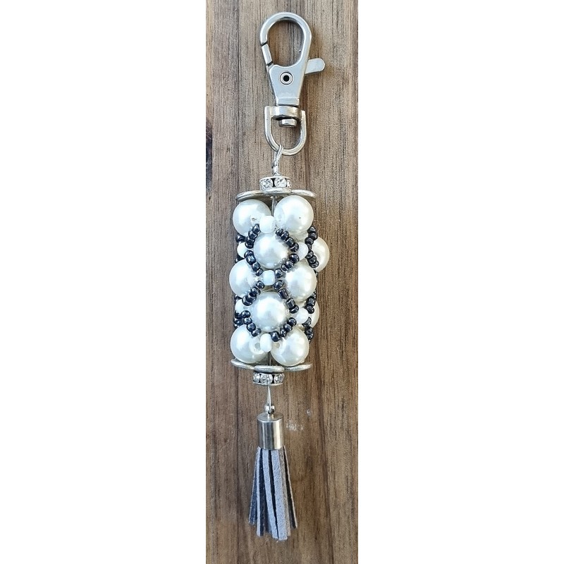 Handgefädelter Schlüsselanhänger weiss/grau/silber