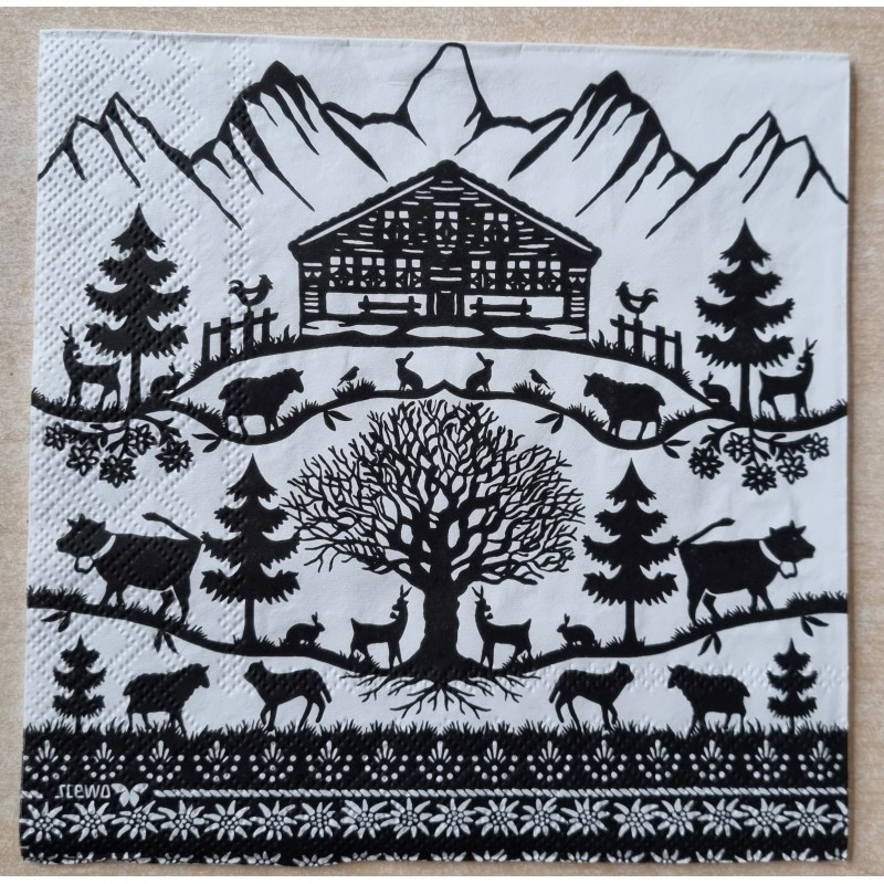 Serviette Scherenschnitt Berge/Hütte/Kühe