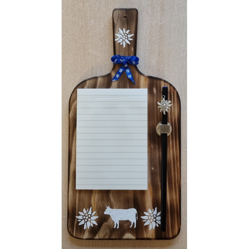 Notizblock mit Bleistift auf Holzbrettchen blau