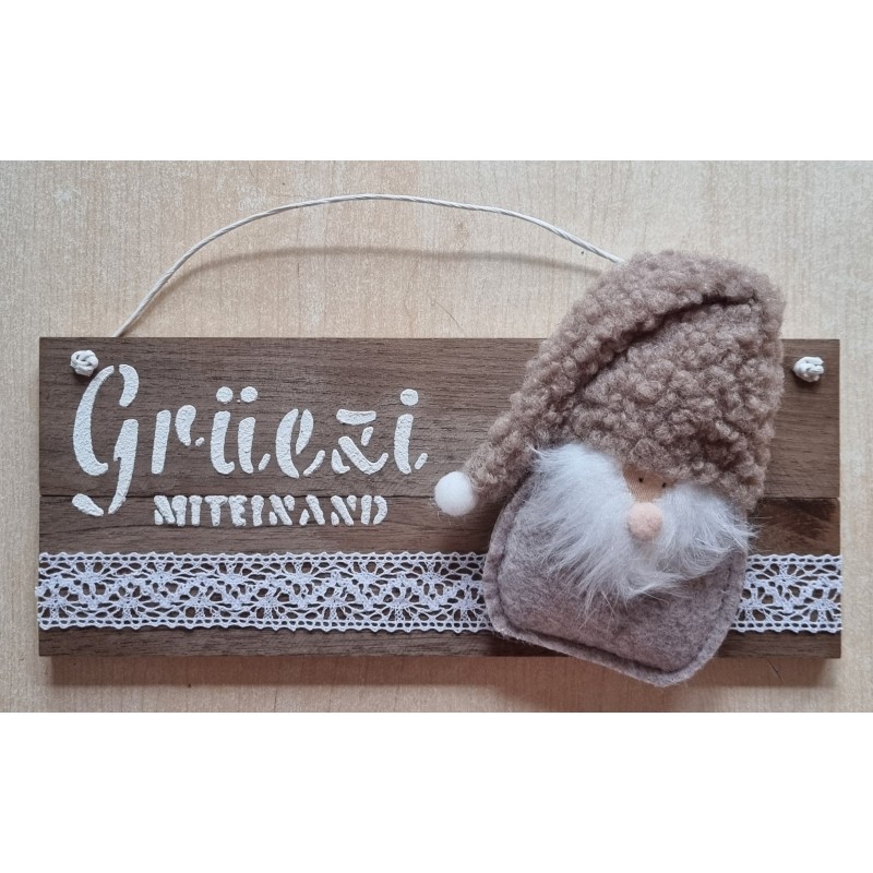 Schild hell " Grüezi mitenand " Stoff Wichtel beige