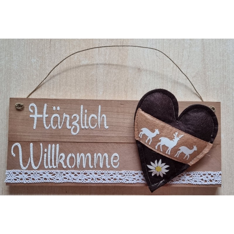 Schild natur " Härzlich Willkomme " Stoff Herz/Hirsche/Edelweiss