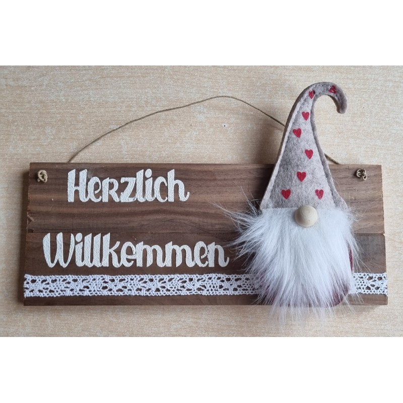 Schild hellbraun " Herzlich Willkommen " Filz Wichtel mit Herzen