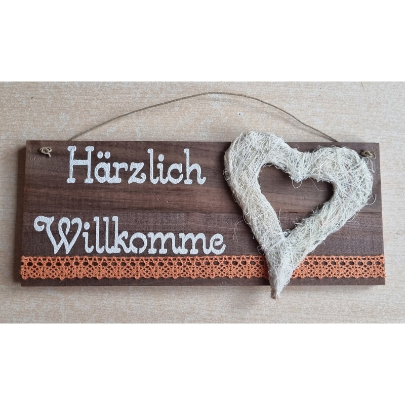 Schild hellbraun " Härzlich Willkomme " Sisal Herz creme/orange