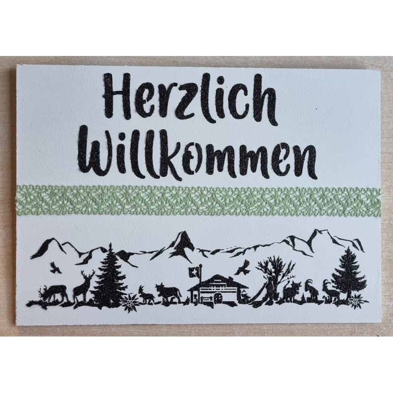 Schild weiss/schwarz/hellgrün " Herzlich Willkommen/Alpenfeeling "
