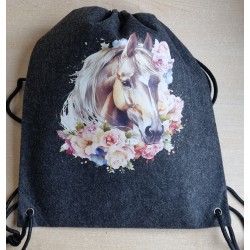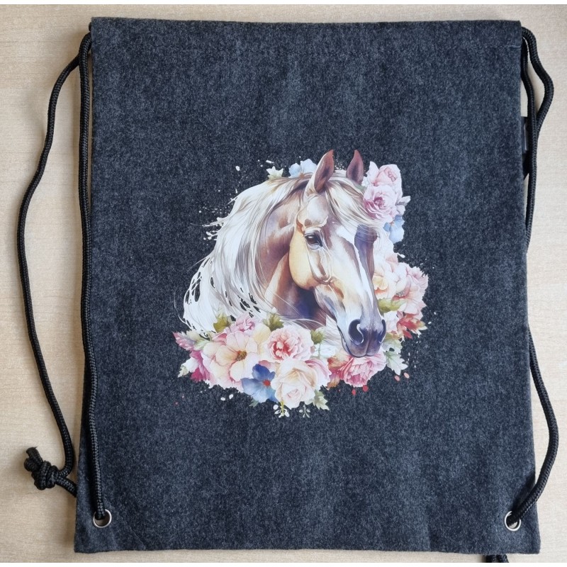 Filz Beutel mit Kordelzug anthrazit Pferd mit Blumenranke