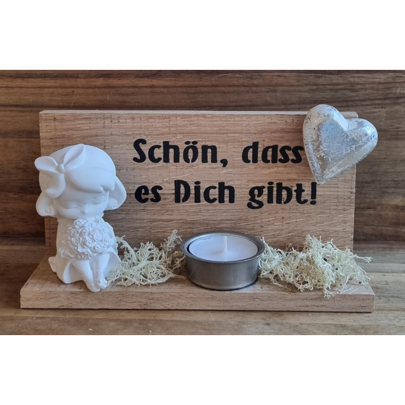 Holz Balken Teelicht "Schön,dass es..." Mädchen mit Blumen schwarz