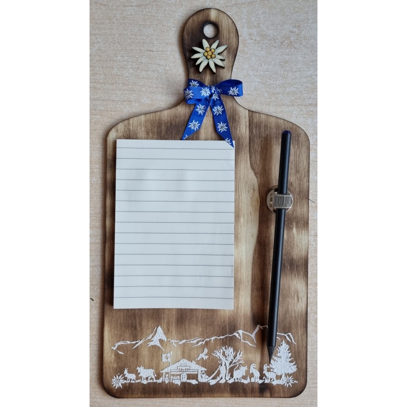 Notizblock mit Bleistift auf Holzbrettchen Alpenfeeling blau