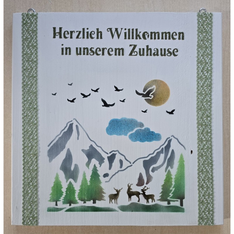Schild "Herzlich Willkommen"/Hirsche, Berge/grün