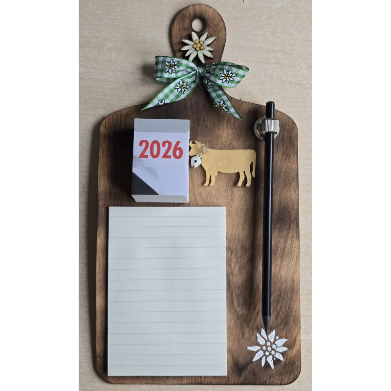 Brettchen mit Notizblock/Kalender 2026 und Bleistift grün