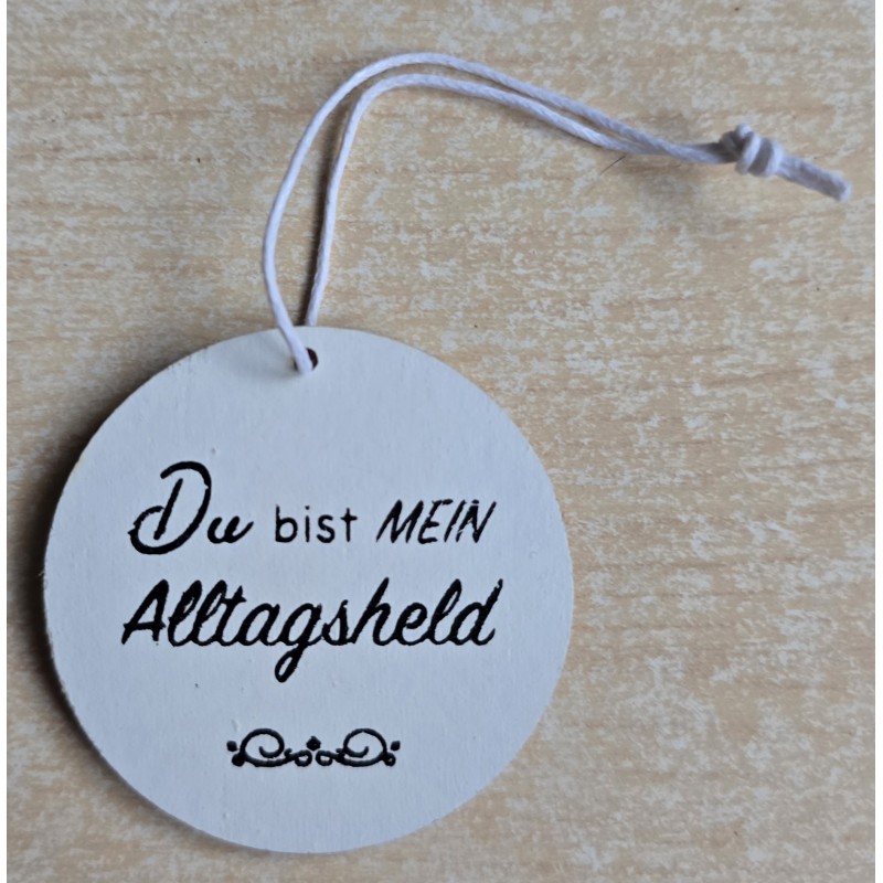 Holz Aufhänger rund " Du bist mein Alltagsheld " weiss