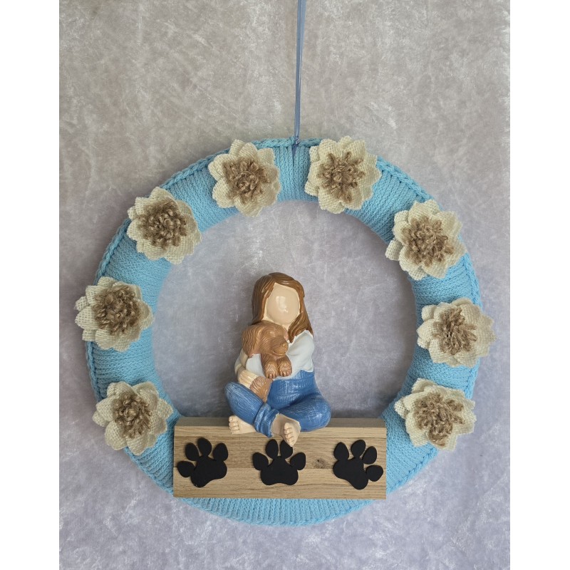 Tür/Wanddeko Ring Frau mit Hund/Blumen hellblau
