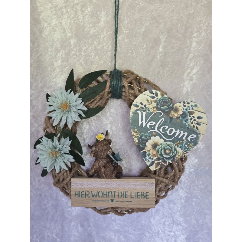 Tür/Wanddeko Jute Schnur Kranz Hier wohnt die Liebe/Welcome/türkis-natur