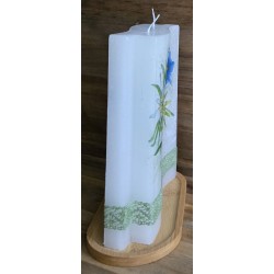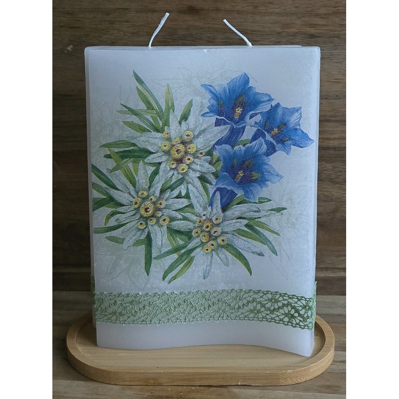 Kerze mit Edelweiss und Enzianmotiv auf ovalem Brettchen